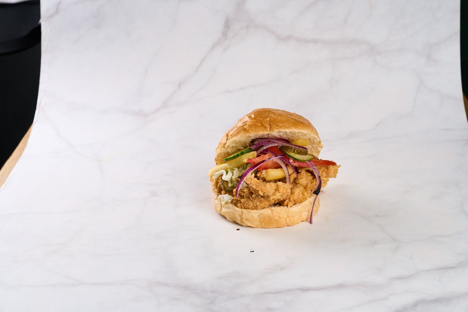 chifla, snitel de pui crocant, rosii, castraveti murati, maioneza