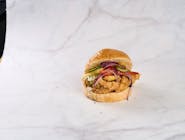 chifla burger, file de pui crispy, ceapa caramelizata, salata iceberg, sos de iaurt
